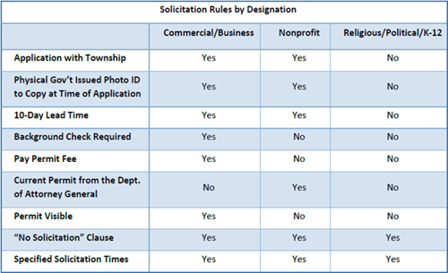 A background check will be performed by the Township for each individual solicitor with Commercial/Business organizations.